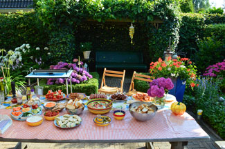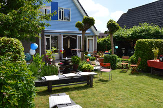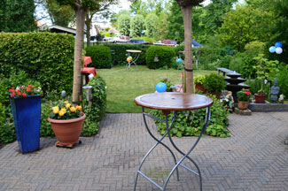 Wegens enkele verjaardagen was voor vandaag de tuin prachtig versierd en getooid in feestelijke tinten. Genieten geblazen dus als straks familie, vrienden en kennissen komen.