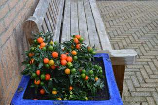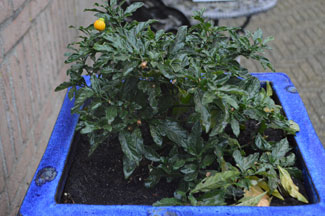 Op deze foto is nog een bes te zien van het Appeltje van de liefde (Latijn: Solanum Pseudocapsicum).