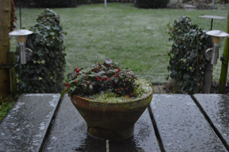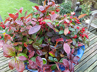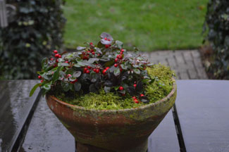 Hoewel op andere plekken in de tuin oude Gaultheria's staan, heb ik deze plant net nieuw gekocht en krijgt het een plek op een tafeltje tegenover de voordeur.