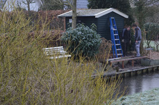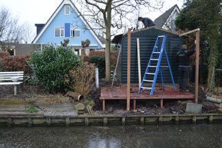 Het was wat een rommeltje daar, maar het wordt nu via een hoveniersbedrijf (Galanthus) netjes opgeknapt, inclusief vlonder. Jelle is de hulp.
