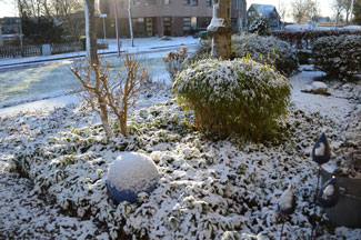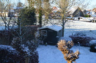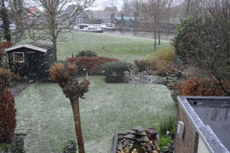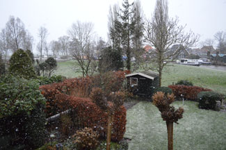 Twee weken na de warm(st)e jaarwisseling viel in mijn sjochtún de eerste sneeuw van het jaar. Uit het slaapkamerraam vandaan een mooie overzichtsfoto van het winterige weer.