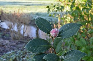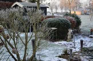 Foto vanuit een iets andere positie en nu met rijp op de planten en de bomen.