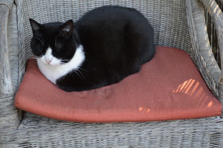 Deze foto is van vrijdagochtend 12 juni; een schitterende dag met zomers weer (29 C) en de kat geniet al in alle vroegte op zijn stoel in het prieel.